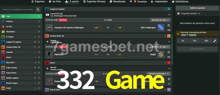 O 332 Game oferece uma grande seleção de opções de apostas em e-sports com probabilidades competitivas